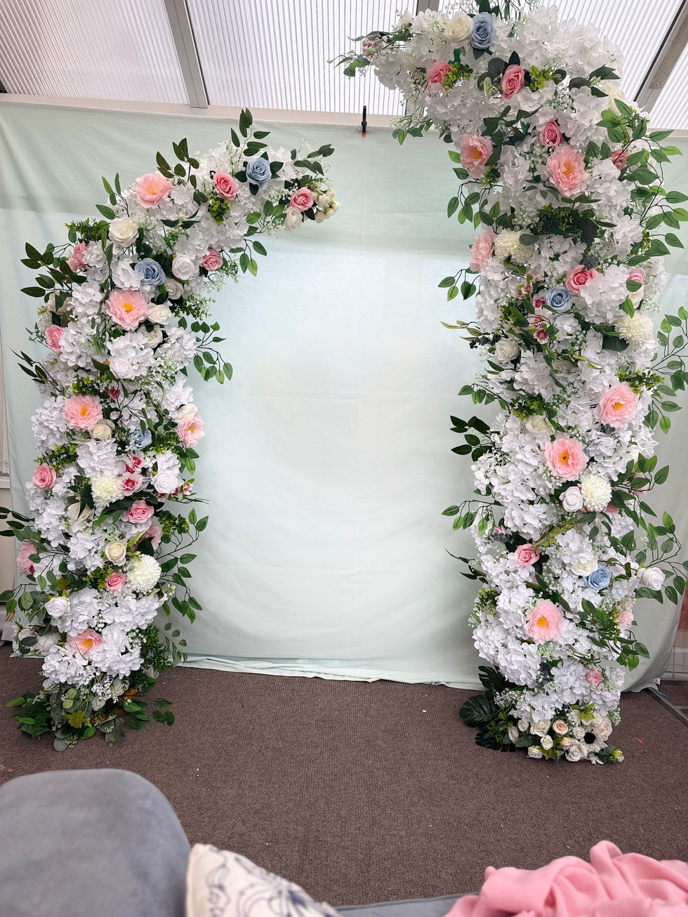 This project showcases elegant wedding decor with white and gold color scheme, including floral centerpieces, lounge arrangements, and table settings.